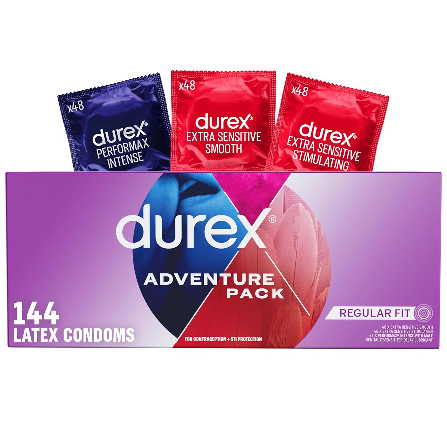 - RIBBED CONDOMS: The Durex Adventure pack contains (48) Extra Sensitive Stimulating Ribbed & Dotted Condoms with tingling lubricant, (48) Performax Intense Ribbed & Dotted Condoms with male climax delay lubricant, and (48) Extra Sensitive Smooth Condoms with extra smooth lubricant.