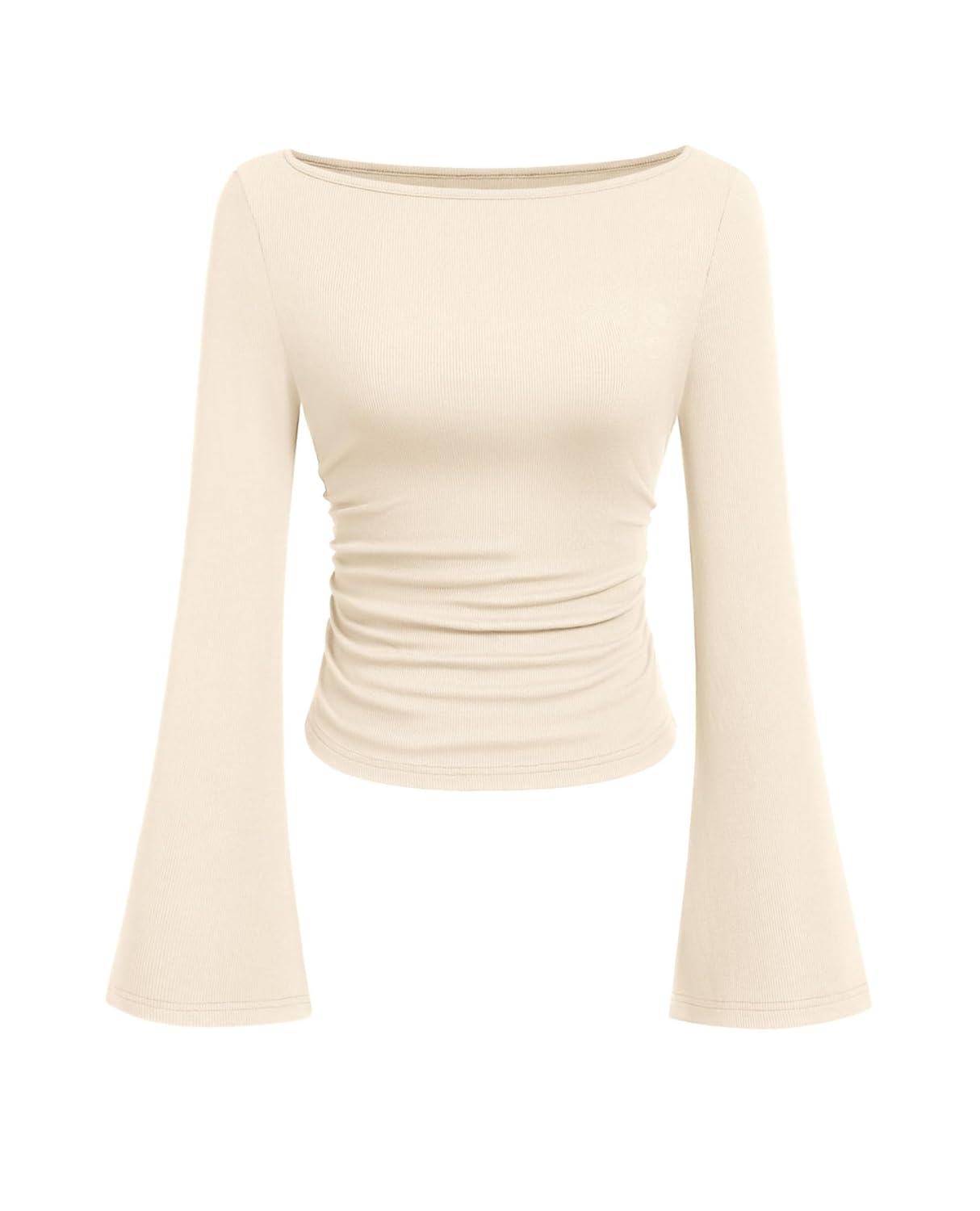 PRETTYGARDEN Womens Long Sleeve Shirts 2026 Spring Crop Going Out Tops Casual Boat Neck Bell Sleeve Ribbed Ruched Y2K Clothes